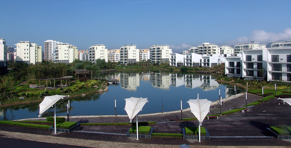 項(xiàng)目于2003年10月開工建設(shè),規(guī)劃共分為六個(gè)多層組團(tuán)、一個(gè)小高層組團(tuán)、一個(gè)低層別墅組團(tuán)以及沿街的公共服務(wù)設(shè)施組團(tuán)。總占地594畝,容積率0.88,綠化率48%,1萬多平方米的人工水景遍布園區(qū),規(guī)劃建筑面積約38萬平方米,居住總戶數(shù)達(dá)3000戶。